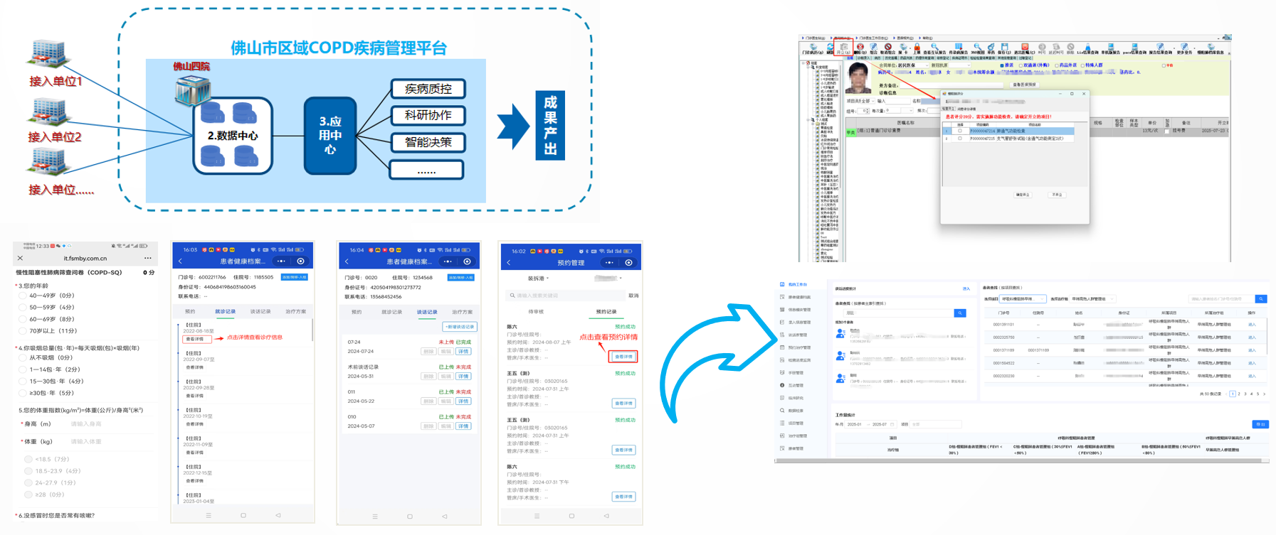 佛山市第四人民医院(佛山市慢性病防治院)牵头建设,从自身医院开始逐渐构建起覆盖全市的慢性呼吸性疾病防治和管理网络。建设COPD患者服务小程序、COPD疾病管理医生小程序、疾病管理信息平台等多个模块,将疾病管理嵌入诊疗服务流程。